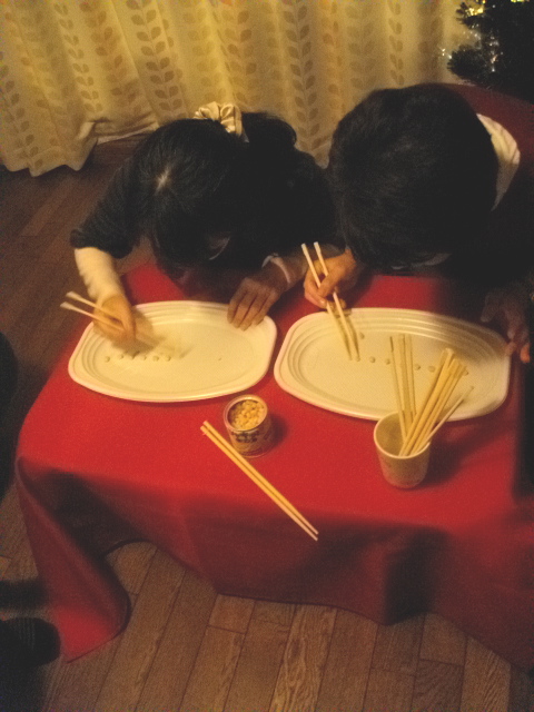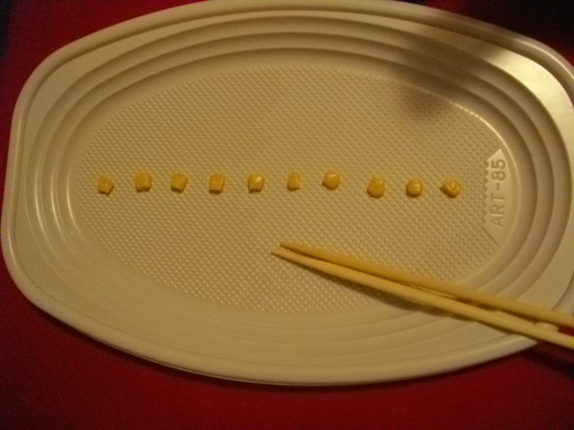 10個並んだコーンを割り箸をうまく使ってどちらがはやく食べられるのか?