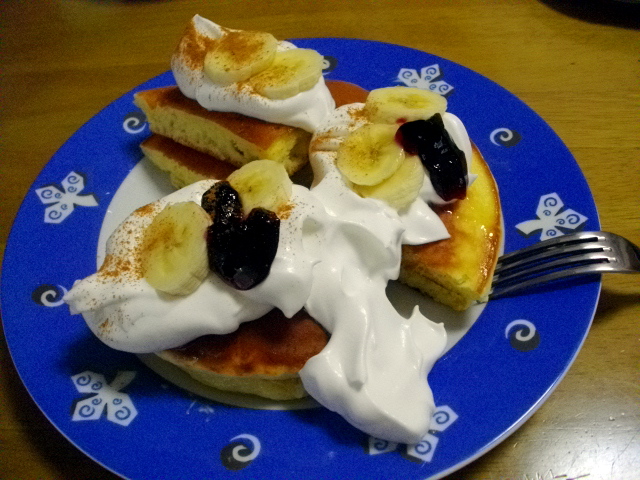生クリーム&バナナ&ブルーベリージャム&シナモンパウダーをトッピング。